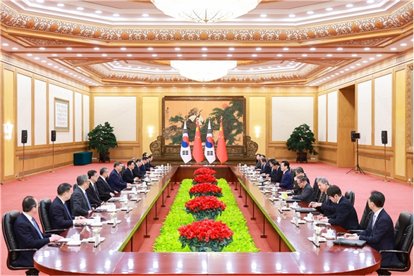 习近平指出,当前世界百年变局加速演进,国际形势更加变乱交织。中韩在维护地区和平、促进全球发展方面肩负重要责任,有广泛利益交集,应当坚定站在历史正确一边,作出正确战略选择。80多年前,中韩两国付出巨大民族牺牲,赢得抗击日本军国主义的胜利。今天更应携手捍卫二战胜利成果,守护东北亚和平稳定。作为经济全球化的受益者,中韩要共同反对保护主义,践行真正的多边主义,为推进平等有序的世界多极化、普惠包容的经济全球化作出贡献。