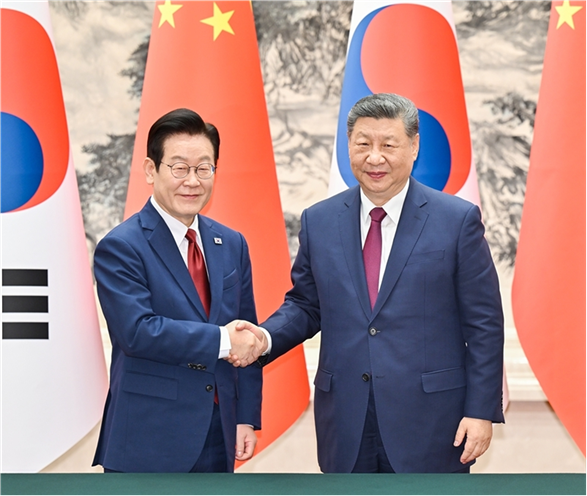 1月5日下午,国家主席习近平在北京人民大会堂同来华进行国事访问的韩国总统李在明举行会谈。会谈后,两国元首共同见证签署合作文件。新华社记者 岳月伟 摄