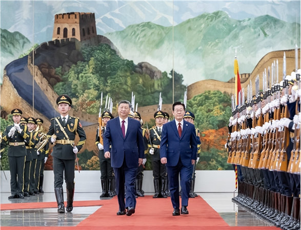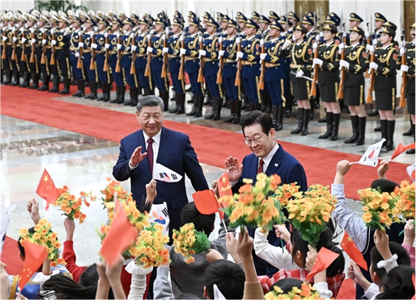 1月5日下午,国家主席习近平在北京人民大会堂同来华进行国事访问的韩国总统李在明举行会谈。这是会谈前,习近平在人民大会堂北大厅为李在明举行欢迎仪式。新华社记者 申宏 摄
